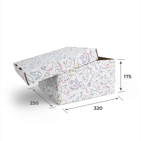 Гофрокороб крышка-дно 320х250х175 изготовлен из трехслойного гофрокатона белого цвета. На изделия нанесена цифровая печать. Модель «крышка-дно», где крышка по каталогу FEFCO 0422, а дно - 0216, очень легкая, компактная и не занимает много места.