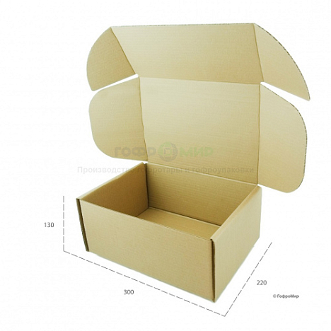 Cамосборный гофрокороб 300x220x130 изготовлен из трехслойного бурого картона марки Т-23 профиль B. Он имеет универсальную и самую популярную конструкцию "шкатулка 0427" по каталогу FEFCO. Короб состоит из поддона и откидной крышки с фиксирующими язычками на ней. Материал тары - прочный трехслойный целлюлозный гофрокартон. Коробка идеально подходит для упаковки мелких товаров. Она смотрится аккуратно и не занимает много места. К тому же, очень просто собирается по заранее отмеченным на производстве биговкам.