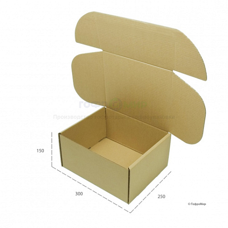 Самосборный короб 300x250x150 изготовлен из трехслойного гофрокартона марки Т-23. Имеет профиль В. Производится в двух цветах: буром и белом (по выбору клиента). Материал коробки состоит из трех слоев: двух плоских и одного гофрированного. Изделие имеет популярную конструкцию FEFCO 0427 с откидной крышкой. Очень удобный картонный короб, который можно использовать для упаковки любой продукции. Собирается он просто - по отмеченным на едином полотне биговкам.