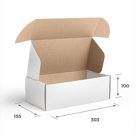 Самосборный гофрокороб 303х155х100 белого цвета изготовлен из прочного трехслойного гофрокартона.