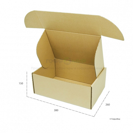 Cамосборный гофрокороб 380x260x150 изготовлен из бурого трехслойного гофрокартона марки Т-23. Имеет профиль В. Такие короба также доступны и в белом цвете. Картонная коробка, изображенная на фото, имеет очень популярную конструкцию по международному каталогу упаковок FEFCO - "шкатулка 0427". Материал, из которого изготовлен короб, трехслойный гофрокартон. Состоит он из 3-х слоев: двух плоских листов и одного гофрированного. Он плотный, хорошо держит форму и является экологически чистым сырьем.