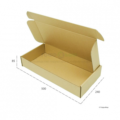 Самосборный гофрокороб 500x240x85 бурого цвета марки Т-23. Имеет профиль В. Характеристики: длина изделия - 500 мм, ширина - 240 мм, высота - 85 мм. Конструкция коробки - "шкатулка 0427" с откидной крышкой. Универсальная картонная коробка, которая подходит практически под любую продукцию. Для того чтобы ее собрать не требуется инструкция, так как складывается она очень просто по биговкам, которые заранее отмечены на едином гофролисте. Транспортируют такие тары в плоском виде.
