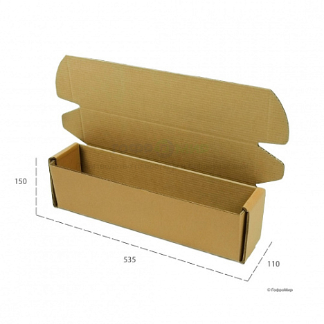 Самосборный гофрокороб 535x110x150 бурого цвета изготовлен из надежного картона марки П-32, который состоит из 5 слоев (2 гофрированных и 3 плоских листа). Конструкция коробки FEFCO 0427 очень прочная (благодаря боковым клапанам и ушкам) и проста в сборке. Материал короба - пятислойный гофрокартон. Он отличается повышеной прочностью, не деформируется и хорошо держит форму. Часто используется для транспортировки, упаковки крупногабаритных и тяжелых товаров.
