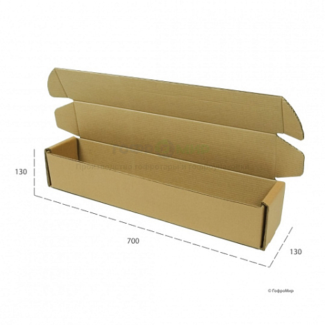Гофрокороб самосборный 700x130x130 бурого цвета изготовлен из марки картона П-32, профиль BC. Коробка имеет простую конструкцию FEFCO 0427 и легко собирается по заранее отмеченным на производстве биговкам. Благодаря 5 слоям, из которых состоит гофрокартон, упакованный товар надежно защищен от механических повреждений. Пятислойный картон используется для изготовления усиленных коробов, которые выдерживают значительный вес и не деформируются при транспортировки товаров.
