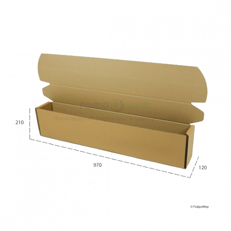 Самосборный гофрокороб 970x120x210 бурого цвета изготовлен из гофрокартона марки П-32 профиль BC. Коробка имеет конструкцию 0427 по международному каталогу упаковок FEFCO. Буквенное обозначение П говорит нам о том, что это пятислойный картон. Состоит такой материал из трех проских листов и двух гофрированных. Все слои скрепляют между собой клеем. Прочность такой тары позволяет перевозить в них достаточно тяжелую продукцию. К тому же, короба из такого гофрокартона очень надежные и защищают упакованный товар от каких-либо повреждений.