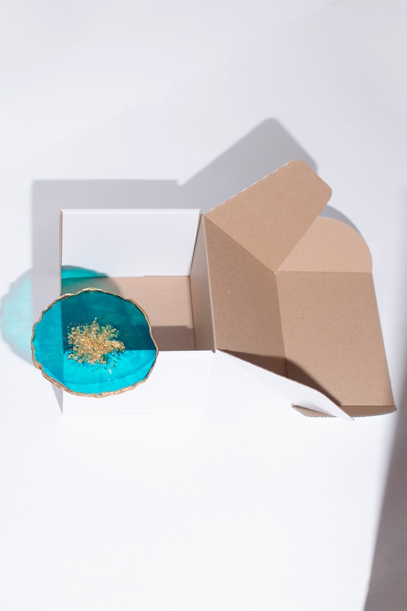 Чтобы сделать коробку привлекательной, не обязательно использовать максимально много цветов и ярких элементов. Достаточно просто разместить на крышке короба логотип и название бренда, как мы и сделали на упаковке нашего клиента.