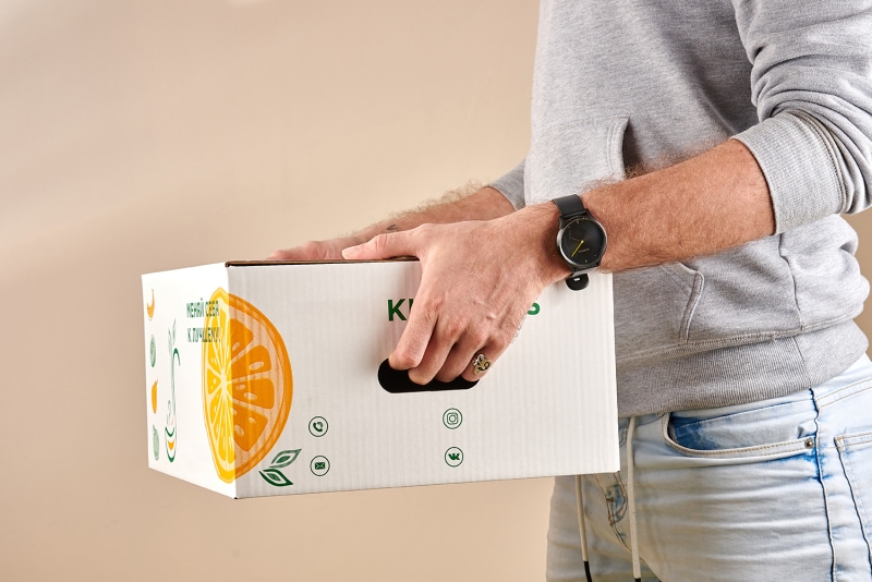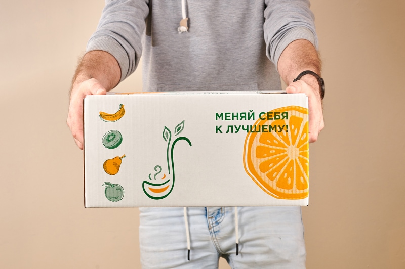 Мы использовали изображения фруктов, кухонной утвари и логотип компании. Помимо этого, дизайнер предложил еще нанести некоторую информацию на крышку короба: инструкцию и правила приготовления продуктов. Клиент одобрил эту идею и уже после всех согласований мы пустили короба в печать.