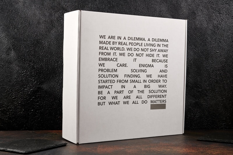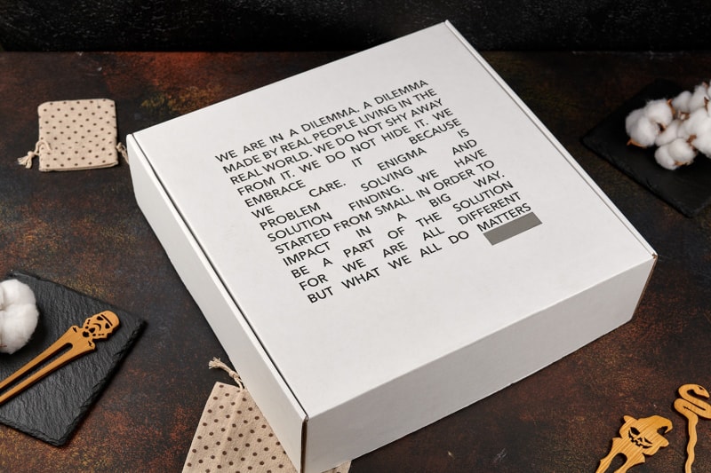 Клиенту было необходимо изготовить коробки двух размеров под его товары. Мы предложили ему использовать одну универсальную конструкцию FEFCO 0427 (самосборная шкатулку) двух разных размеров и с одинаковым дизайном. Заказчик согласился. В качестве материала взяли прочный микрогофрокартон.