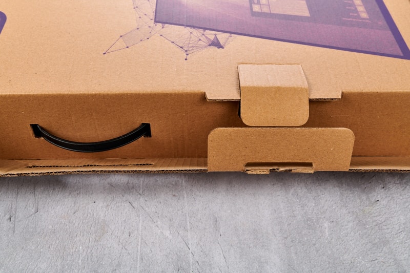 У нашего заказчика были индивидуальные запросы и пожелания по упаковке, поэтому мы взяли за основу две конструкции и соединили их в одну. Получился своеобразный “гибрид” FEFCO 0215 и 0216. Верх состоял из 4-х клапанов и 2-х замков, а низ стандартный, который необходимо склеивать скотчем. Также на клапанах сверху мы сделали отверстие для крепления пластиковой ручки, как и хотел клиент. Плюс к этому мы добавили еще и ложементы, которые позволили прочно фиксировать мониторы внутри короба.