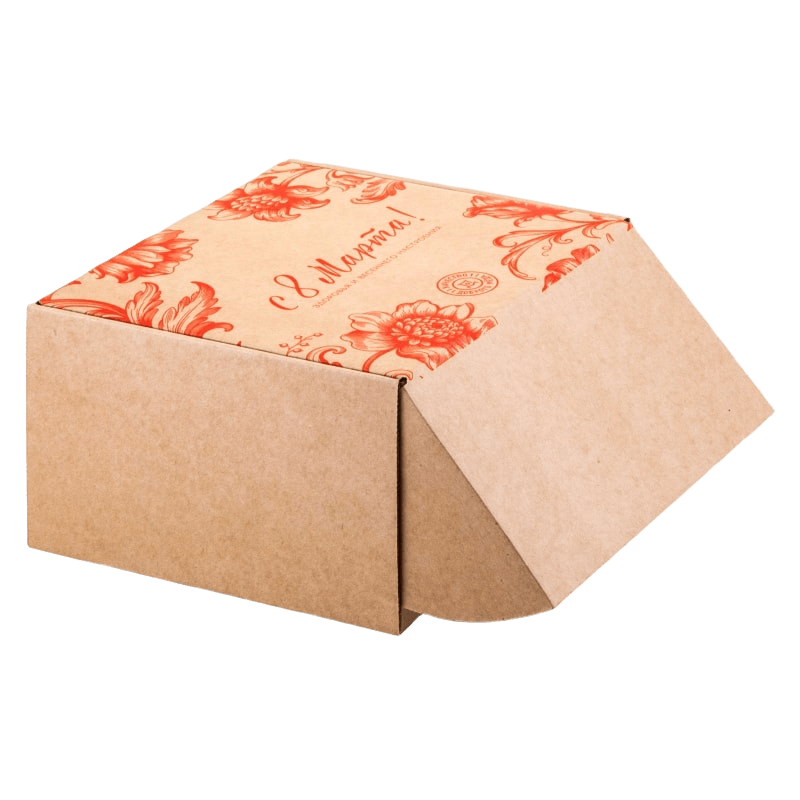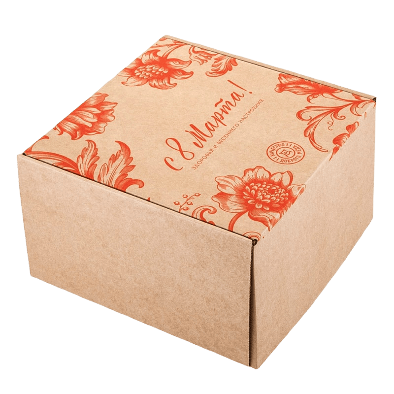 Чтобы подчеркнуть, что подарок внутри коробки изготовлен вручную, клиент выбрал оформление в стиле «крафт». Для создания цветочного весеннего дизайна мы предложили нанести на коробку одноцветную флексопечать красного цвета и выбрали цветочное оформление.