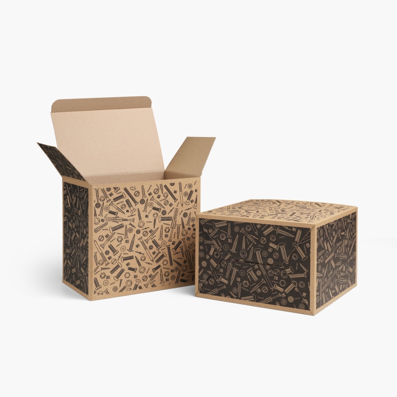 Для большого количества метизов и саморезов мы подготовили большую коробку с дном типа “ласточкин хвост”. Она заранее склеивается на производстве сбоку и отправляется клиенту в виде заготовки, которая собирается за несколько секунд. Сверху коробка закрывается крышкой.