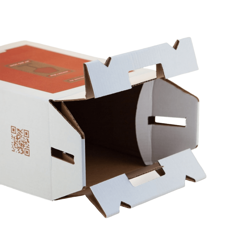 Опираясь на потребности нашего клиента, мы подобрали универсальную и максимально практичную модель короба - FEFCO 0217 (чемоданчик с ручками самосборного типа). Эта упаковка надежная, прекрасно держит форму и в ней можно спокойно транспортировать хрупкие товары (например стеклянные предметы), не боясь за их сохранность. Далее мы ее немного модифицировали, сделав двухслойные "ушки", чтобы коробка выдержала значительный вес упакованного товара.