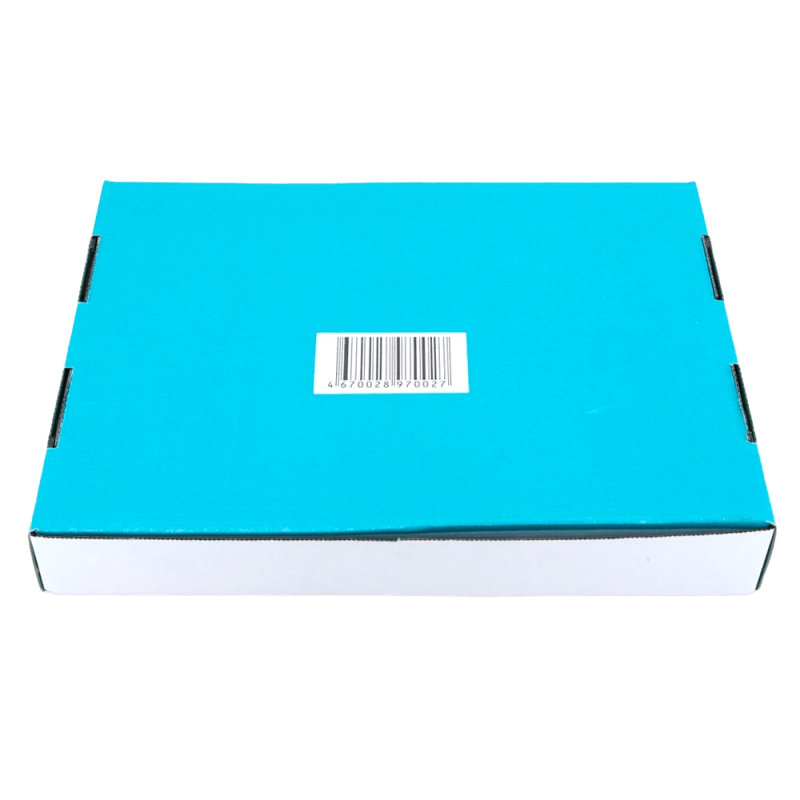 Дизайн на короб нанесли с помощью техники флексографической печати в два цвета, а изготовили тары из белого гофрокартона. Выбранные нами пантоны - сине-зеленый (цвет морской волны) и насыщенно-черный.