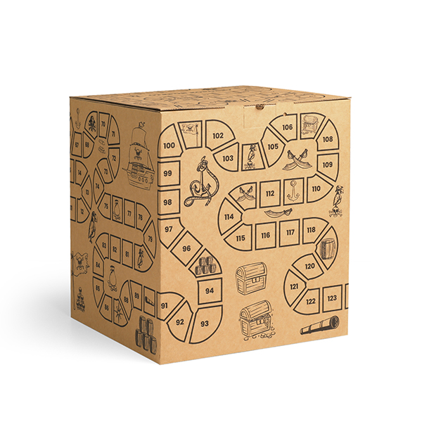 Мы выбрали монохромный вариант оформления для бурой коробки и разместили все игровые элементы на упаковке, стильно сочетая их между собой.